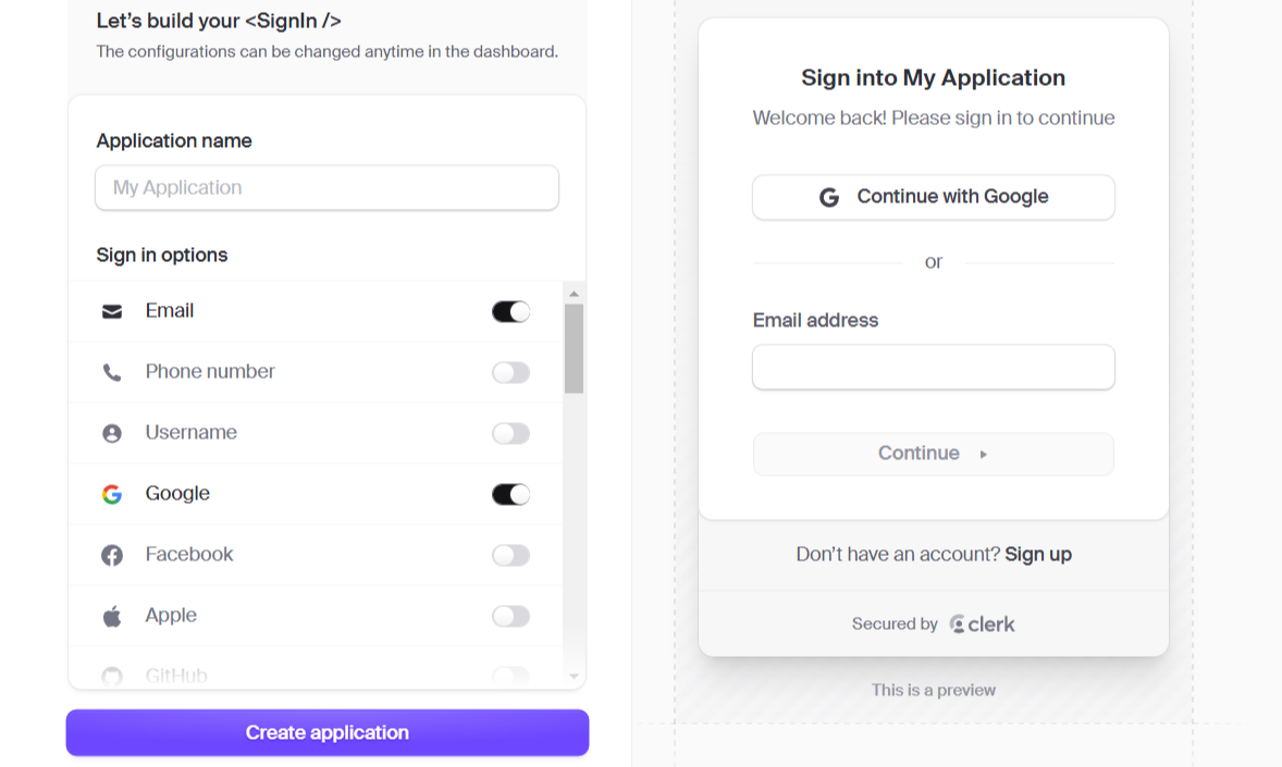 - Go to Clerk website and create an application. Select google and github as sign in options: