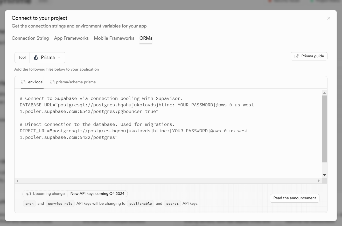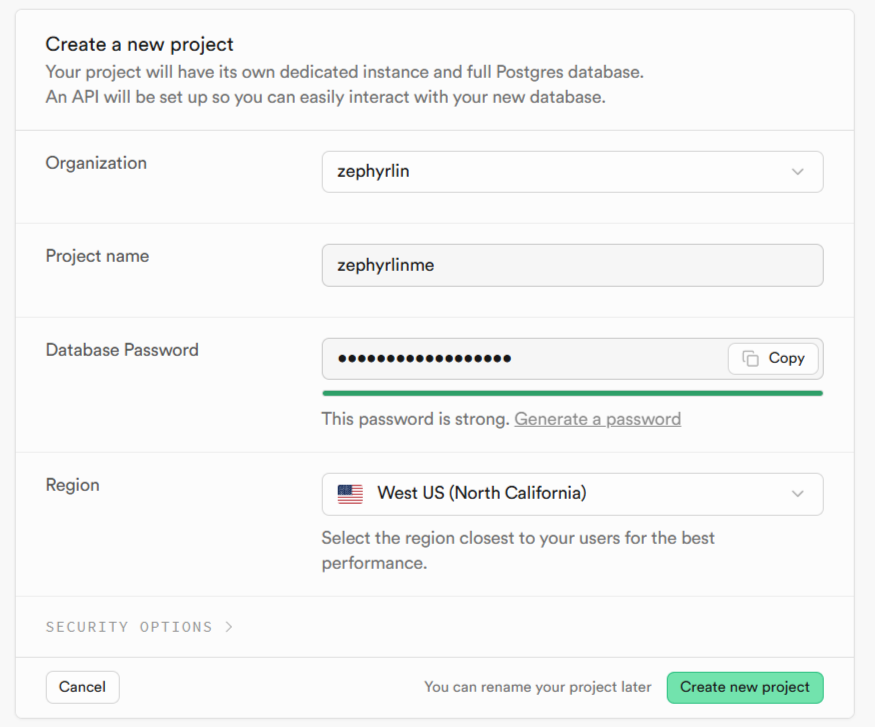 Go to Supabase. Create a new project. Important: store the password here somewhere as you will be using it in the 3rd step. Wait a few minutes for supabase to set up the project.
